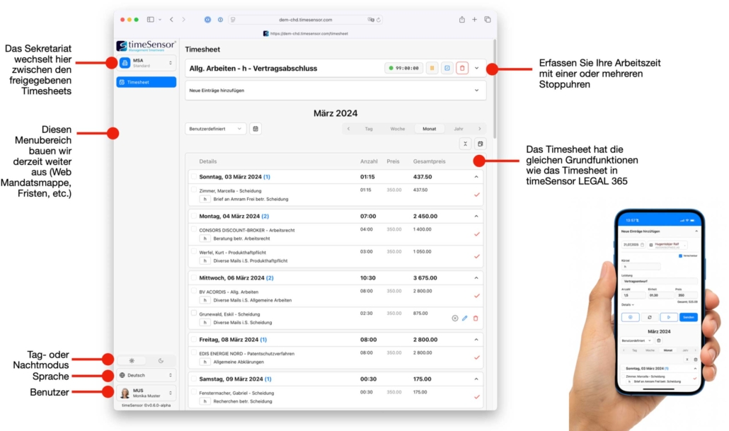 Im persönlichen Timesheet, sowie im Mandatstimesheet, zeigen leicht verständliche Icons neben den erfassten Leistungen auf einen Blick den Verarbeitungsstatus Ihrer Leistungen an.